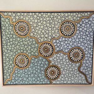 Jess describes herself as a contemporary Aboriginal artist. Each piece she create depicts either a story or personal meaning. “I like to let my emotions and instincts guide me as I paint, so while I might have a concept or vision when starting I never truely know how it will turn out.” Professionally, I have been involved in delivering cultural workshops and programs over the years in local schools, and preschools through my work at Pejar LALC. Some of these involved Acknowledgement To Country workshops, showing Aboriginal artefacts, teaching Aboriginal culture and history, helping students create Aboriginal art and even completing a mural myself for Crookwell SDN preschool.