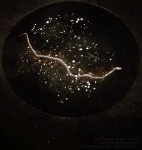 Judith Nangala Crispin, Ascending Being 45–Zoe descends to comfort her daughters, in a burning country. Lumachrome glass print, cliché-verre, chemigram. Smoke killed baby tiger snake on fibre paper with seeds and honey (for the stars – constellation lines drawn on with pencil) and glass plate. Exposed 32 hours in rain and bushfire smoke, then rubbed with charcoal from the burned trees. Courtesy: the artist.