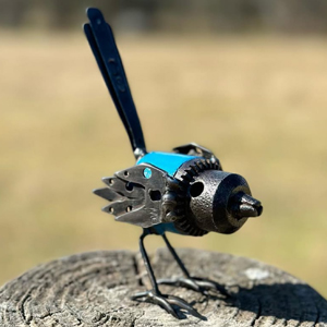 Blue Wrens – main body made from old drill chucks, wings are sheep shearing blades with fencing wire for the legs and feet.