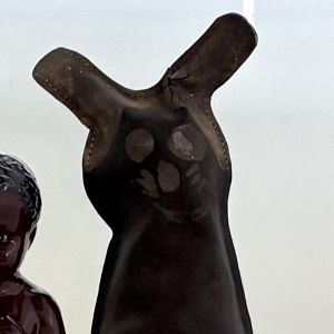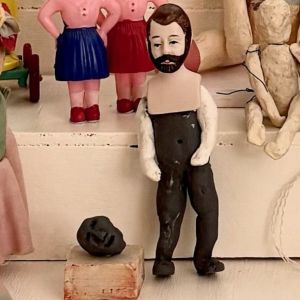 Man: My brother made this. He lost his head early on which left him with a sense of brokenness. As is the way of mystery, a handsome, perfectly fitting new head arrived! Although Man enjoys his new head, he keeps his old head close, understanding that he’s now a man of many parts — and not broken at all.
