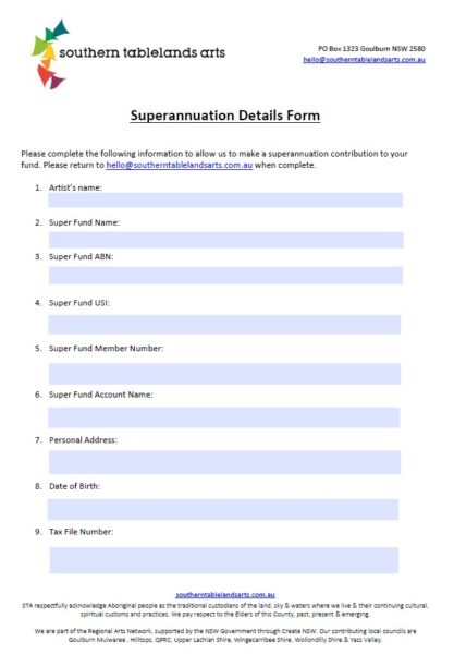 This form is required to be filled in by the Artist only once and STA will keep the details on file for subsequent superannuation payments as needed. Another form will need to be supplied if the artist changes to a different superannuation fund.