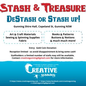 1 Mar – Stash and Treasure, de Stash or Stash up!! – All sorts of craft materials to get rid of or stock up on, at the Gunning Shire Hall 9 – 2pm. Find out more